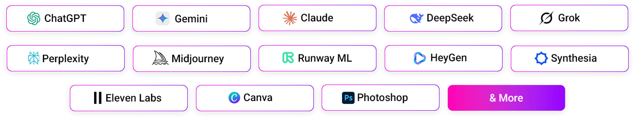 That Are Powered By The Latest AI Models Like ChatGPT, Gemini, Claude, DeepSeek, Grok, Perplexity, Midjourney, Synthesia, Eleven Labs, & More…
